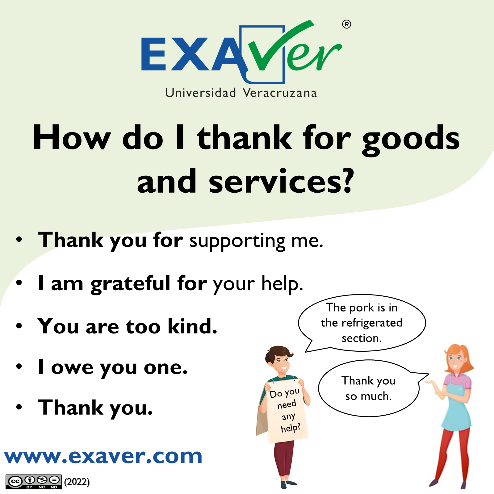 EXAVer, Universidad Veracruzana. (2022, 31 mayo). How do I thank for goods and services? [Ilustración].