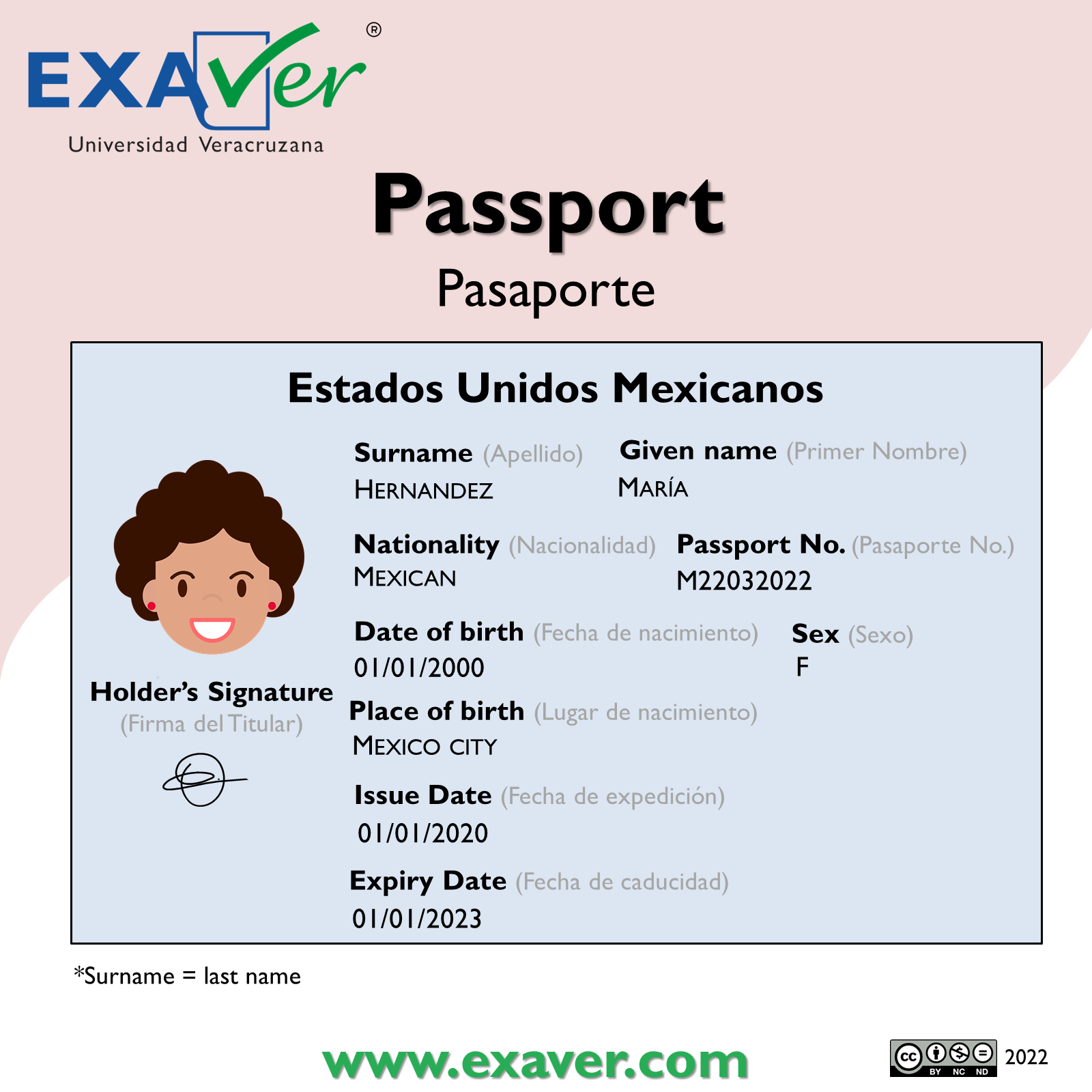Ilustración sobre el vocabulario a nivel A2 del contenido de un pasaporte para familiarización sobre el uso en contexto.