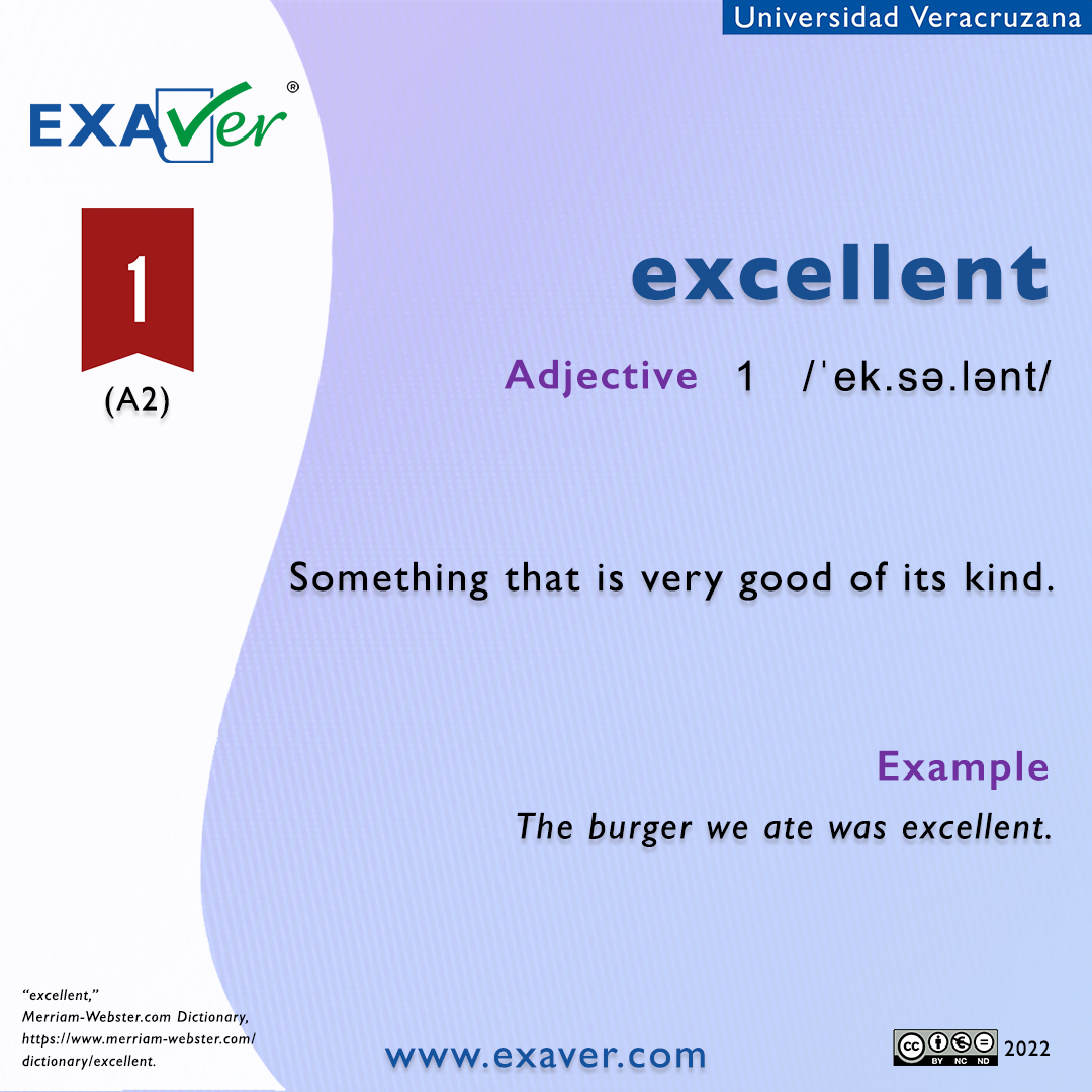 Infografía con la descripción de la palabra excellent y su uso en contexto para el nivel A2.