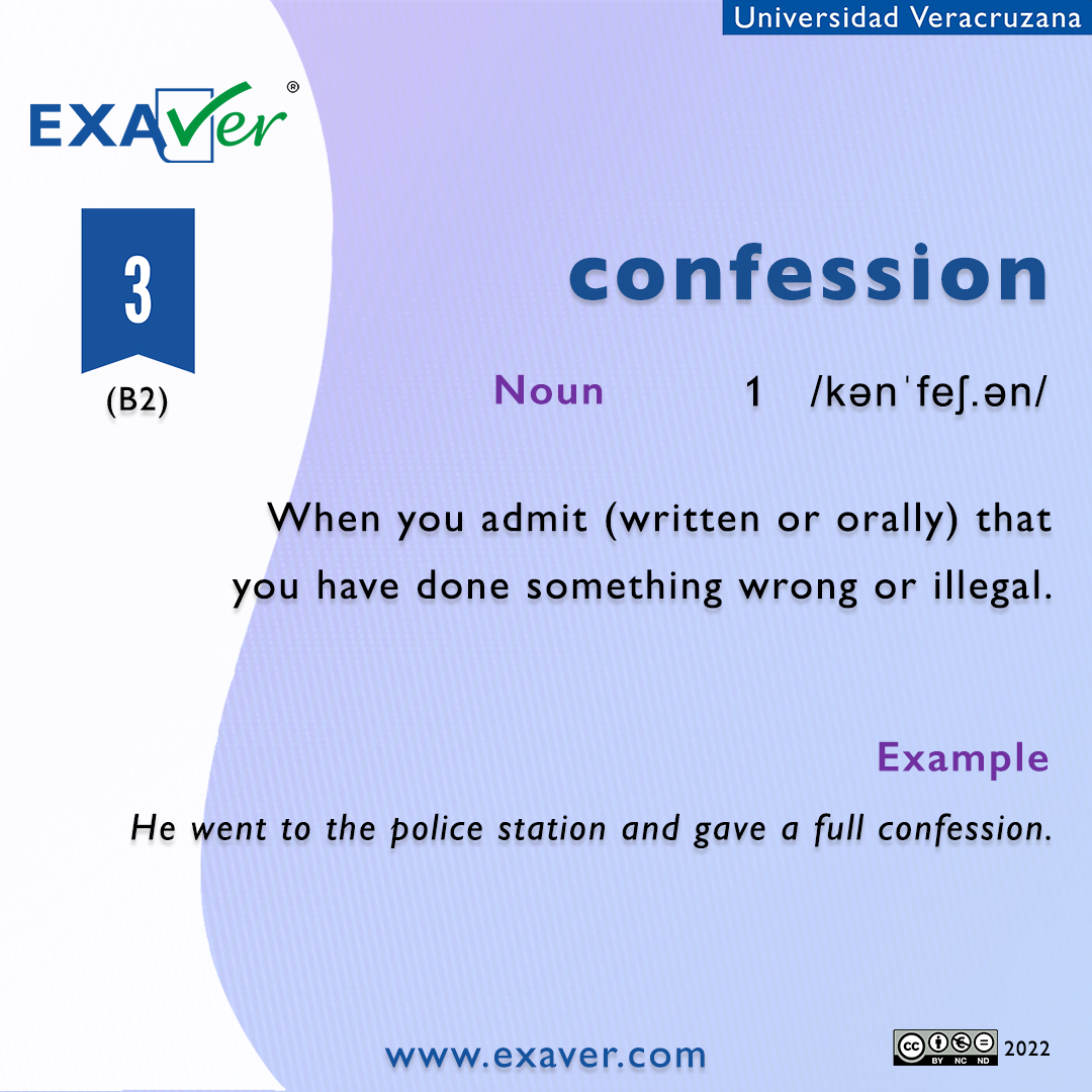 Infografía con información de la palabra confession y su uso en contexto a nivel B2.